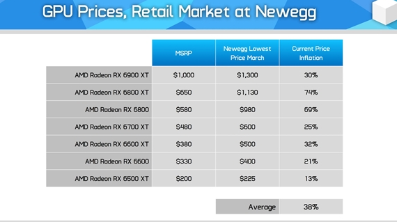 新蛋上只统计了当前溢价幅度,NVIDIA、AMD分别为50%、38%,相比eBay良心很多。